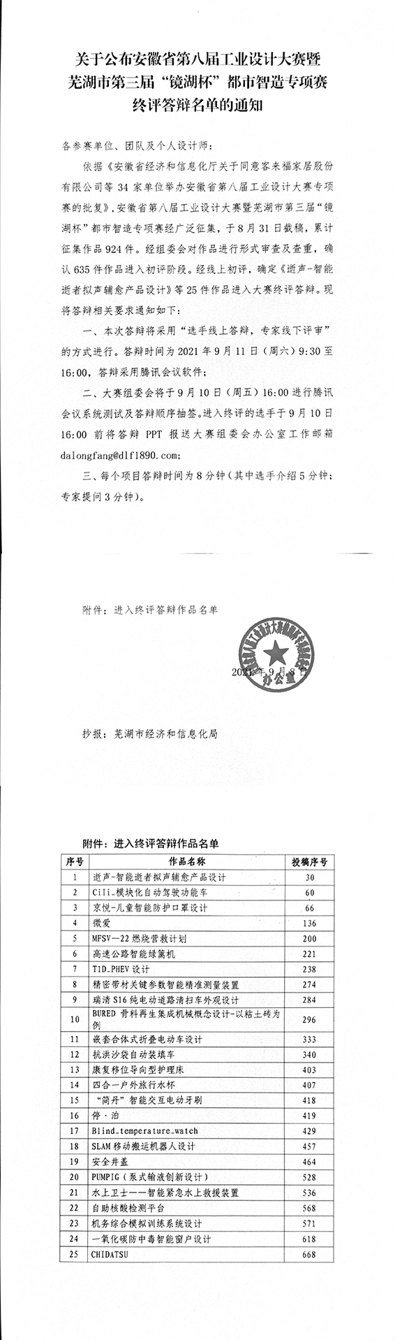 關于公布安徽省工業(yè)設計大賽“鏡湖杯”專項賽終評答辯名單的通知